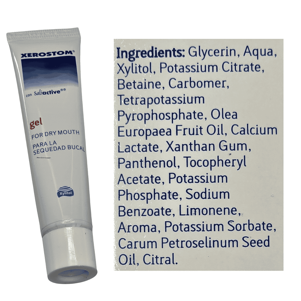 Xerostom Saliva Gel contains Xylitol which helps to prevent tooth decay – a major problem for anyone with long term dry mouth. In particular the risk of root surface decay (e.g. from gum recession) is high for anyone who has little or no saliva.